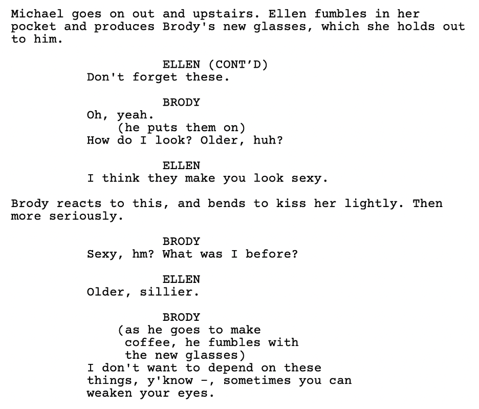 An element of the screenplay that’s cut from the film is setting up Brody’s new glasses. Here: