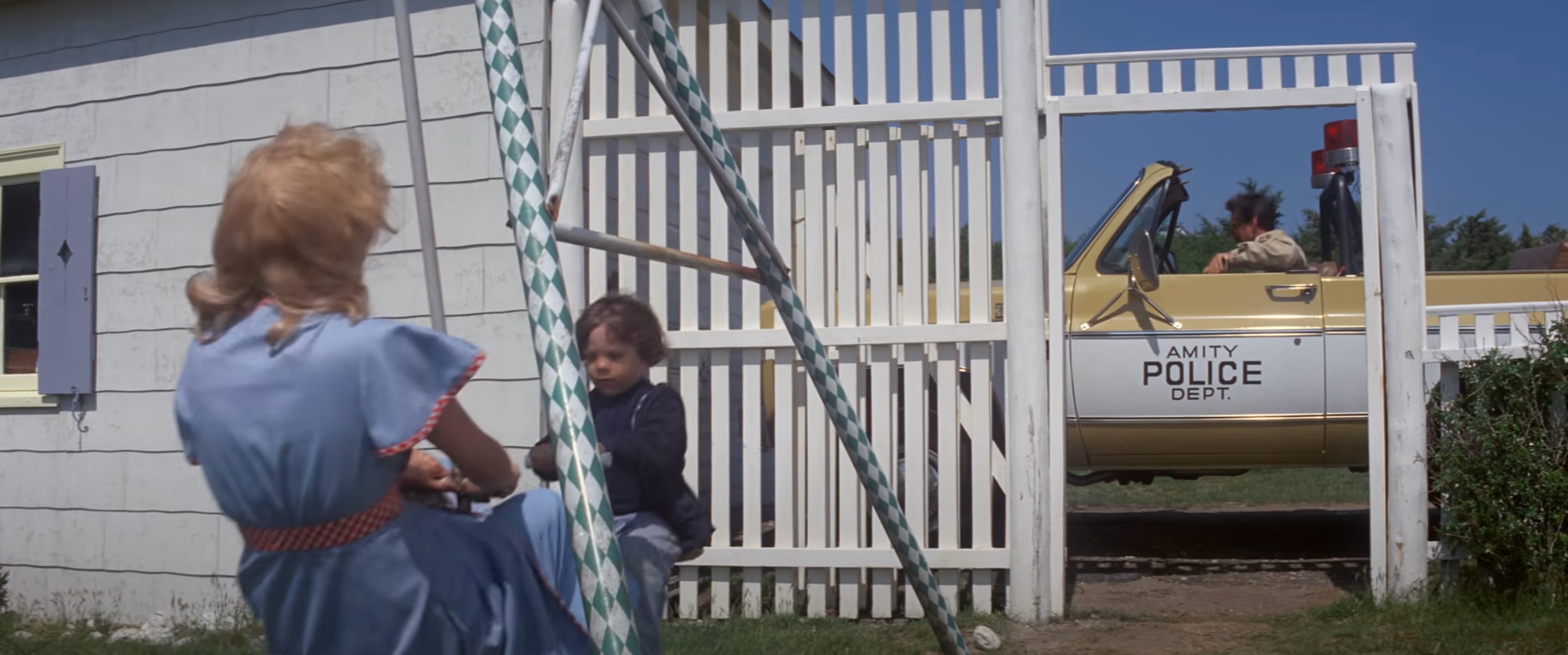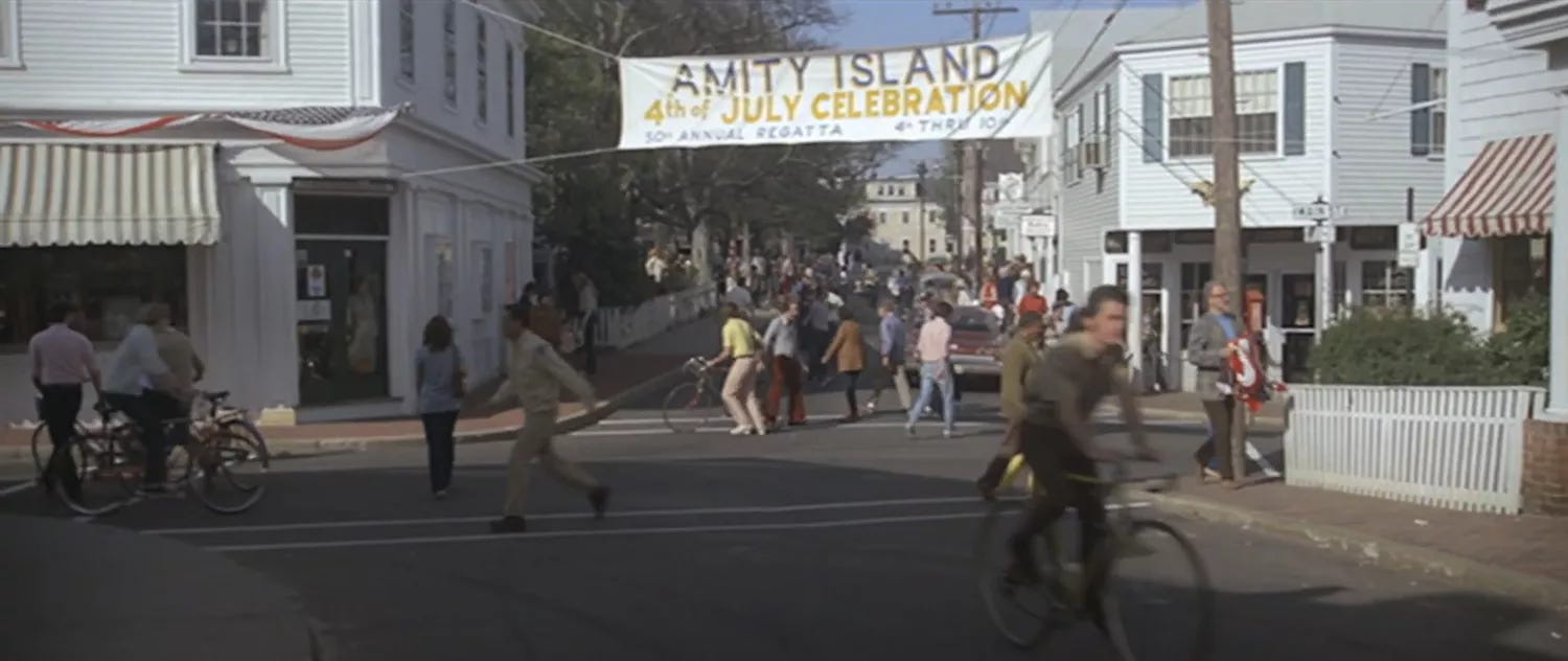 Brody hurries out of the police station to solve the problem created by the lack of appropriate signage in his department’s supply closet. In doing so, he gives Steven Spielberg the opportunity to visually establish the geography of this seemingly perfect small town. It couldn’t be more beautiful. There’s even a marching band rehearsing for a parade (how Norman Rockwell!) and birds singing loudly. Another sign reminds us that the July 4th celebration is almost upon us, to reinforce the antagonists’ stakes.