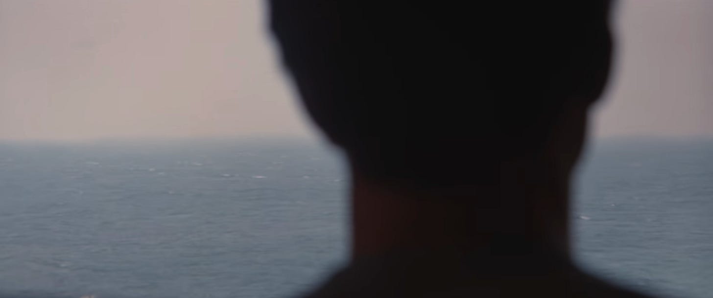 Returning to my description of the shot of the ocean, blindingly bright — a shadowy figure rises into in the extreme foreground, peering out at the ocean that we’ll later learn scares him so much. In other words, his introducing is staring down his existential enemy — the thing he’ll have to overcome to ultimately triumph. This is a man vs. nature story.