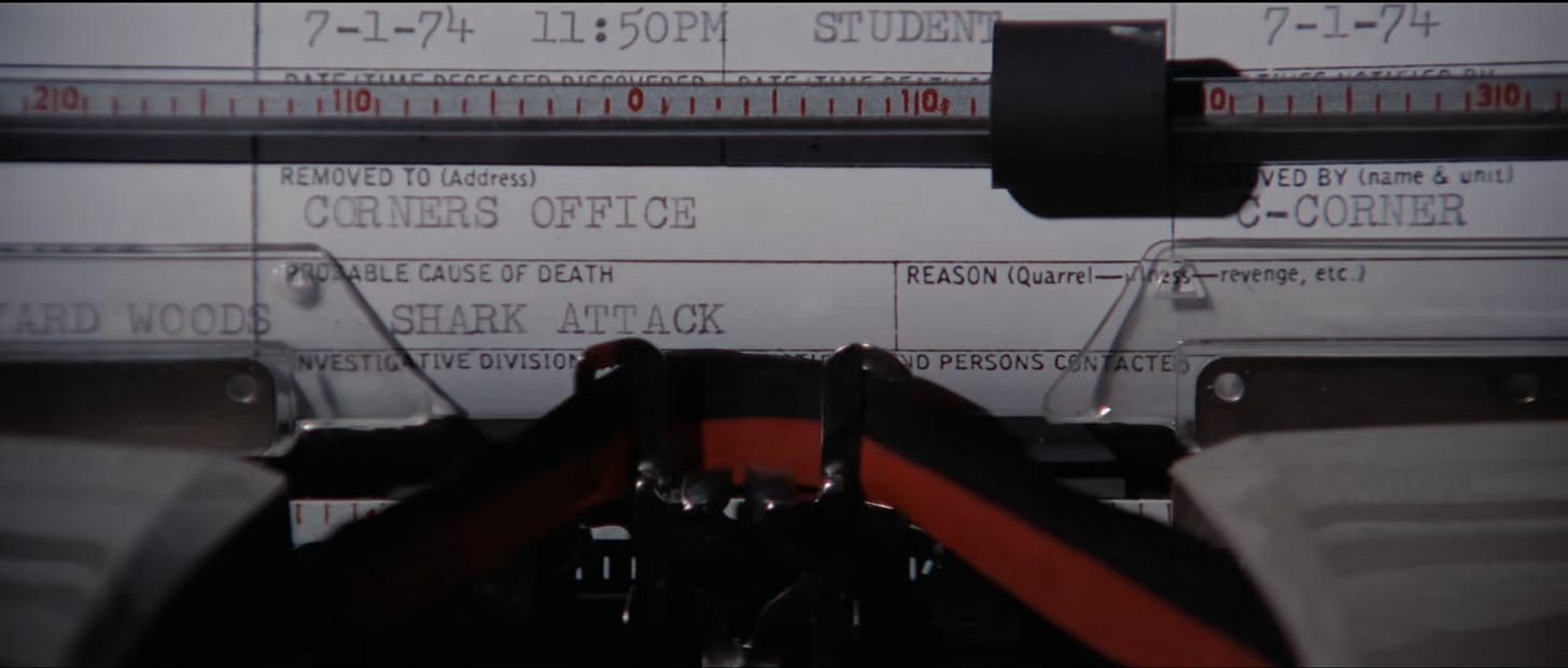 The CORONER calls and tells Brody the answer to the question you might’ve had about why the police chief is typing right after discovering a dead body. In the space for Probable Cause of Death, Brody types what the film’s poster already told us: