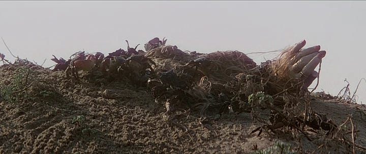 A moment later, only 08:40 into the film, the body of the young woman is discovered. We only catch a glimpse of her hand sticking out of a sand and mob of crabs.