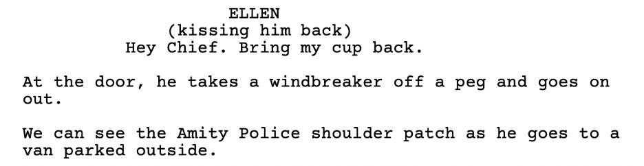 This isn’t what happens in the film, though. Spielberg moves this exchange outside the Brody household, to create a sense of movement to the act, where Brody climbs into a convertible SUV. It’s only here that Ellen calls him “Chief” for the first time.