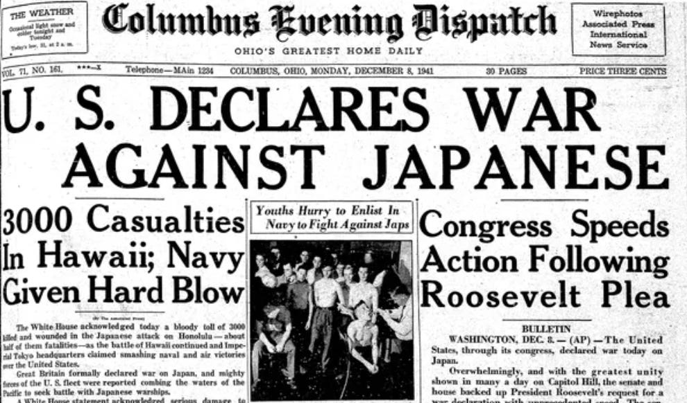 The Imperial Japanese Navy Air Service stages a surprise attack on Pearl Harbor in Hawaii, killing 2,403 U.S. personnel. The next day, the United States declares war on the Empire of Japan and, at last, its allies Germany and Italy. Transatlantic shipping channels are immediately locked down, making it impossible for Otto Frank to get his family out of Europe.