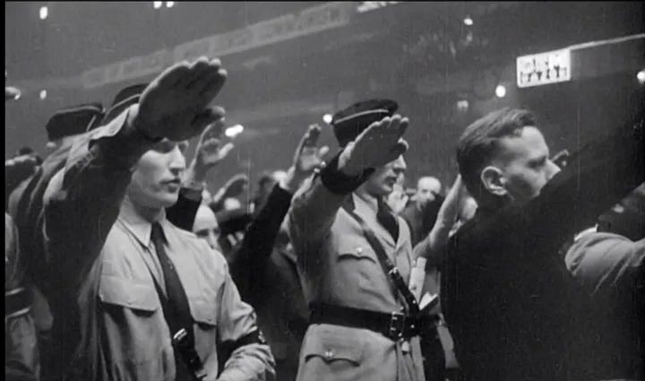 In the film, thousands of arms snap up in a stiff-armed salute to the Fuhrer – and I feel my arm move ever so slightly.