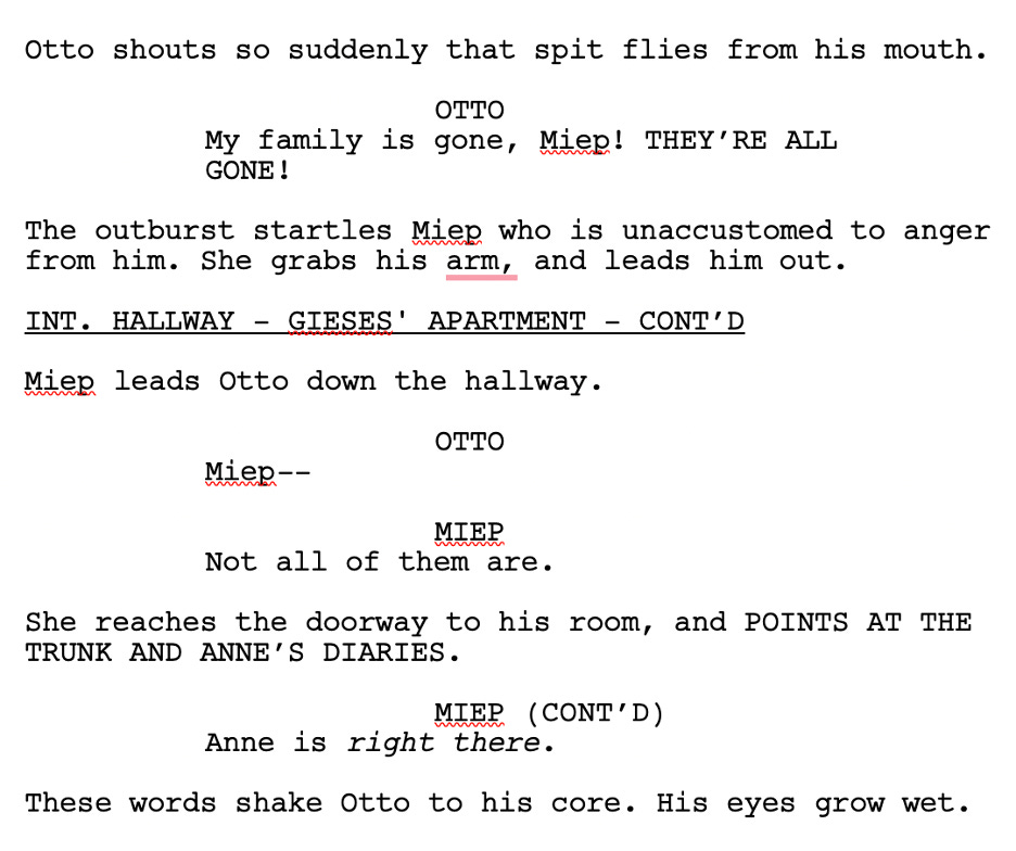 And then, I proceed to lay out a feature film about Otto Frank’s return to Amsterdam and attempt to come to terms with his family’s deaths — and perhaps even his part in them — through his daughter Anne’s diaries. I include the film’s opening scene, every major turn, its midpoint and low point, and the final scene. I’m channeling something here, or however you want to describe it, and my wife can see it on my nervous face.