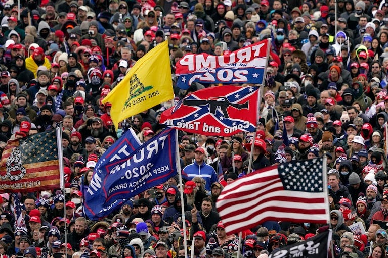 A mob of supporters of Donald Trump, many of them armed – a sea of white faces, many of them clothed/painted in or waving the American flag – storm the U.S. Capitol Building in response to his call that they fight back against what he calls election fraud. Confederate flags and Nazi imagery are rife. Later, Feds will testify that they saw the Nazi salute being used, as well.