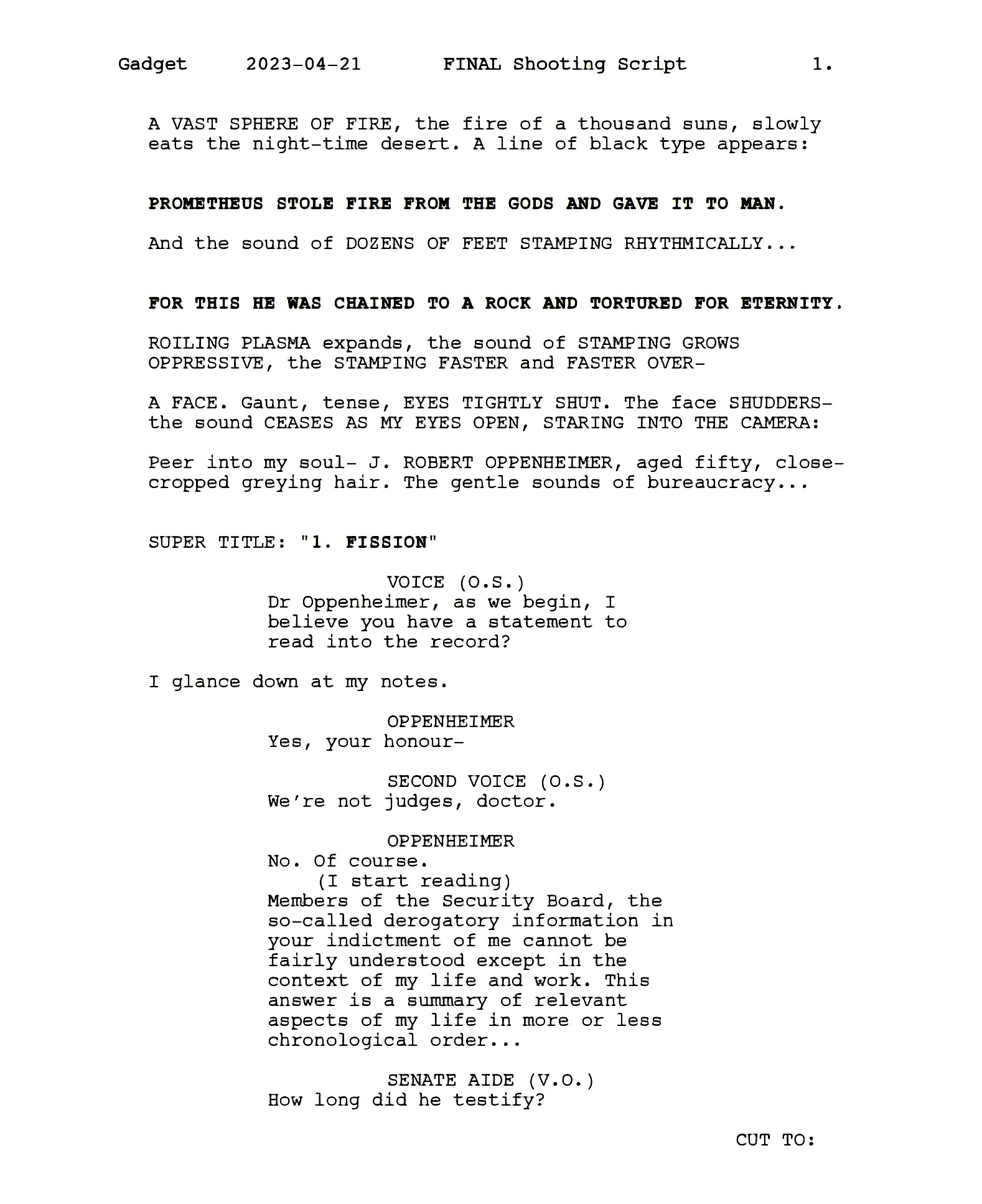 I’m going to dive in by assuming you haven’t read Oppenheimer’s screenplay yet. I’ll provide a link at the end of this article, but for now, check out Page 1.