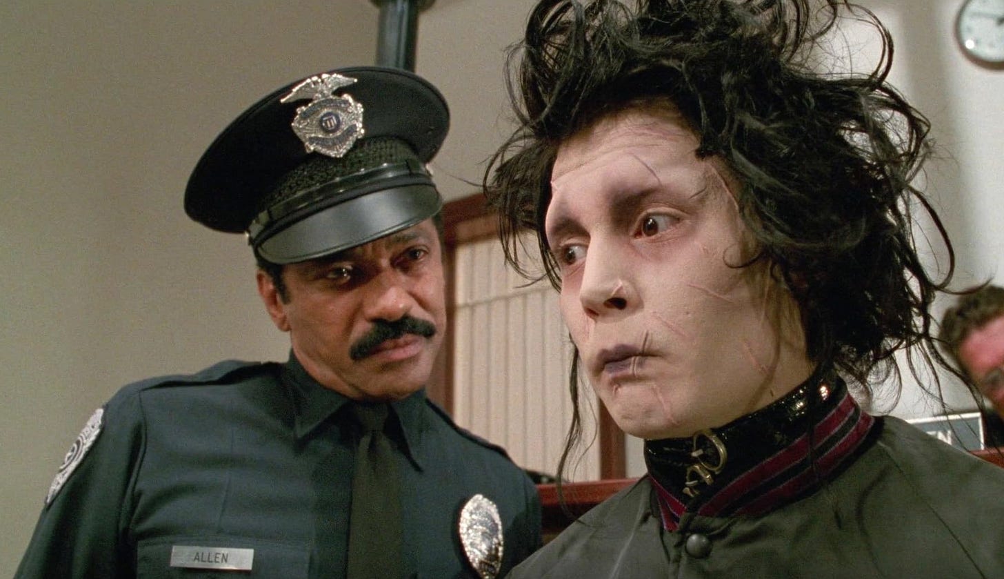 By casting Dick Anthony Williams as Officer Allen, every scene in Edward Scissorhands takes on meaning not found in the script. By altering that script on set, by having Williams/Allen stand up to the mob, Burton also revealed his awareness of what was happening to his story when he did this.