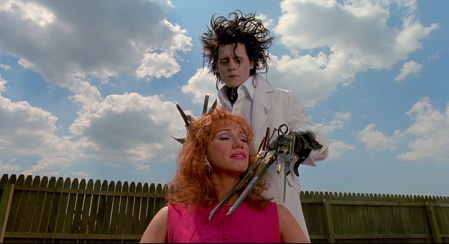 He’s the art kid, the goth, the emo freak with scissors for fingers. In every possible way, he does not fit into this sleepy, monotonous suburban community. Maybe he’s supposed to represent the hippies’ counter-cultural revolution that Tim Burton grew up during, but I’m skeptical. Consider the following: