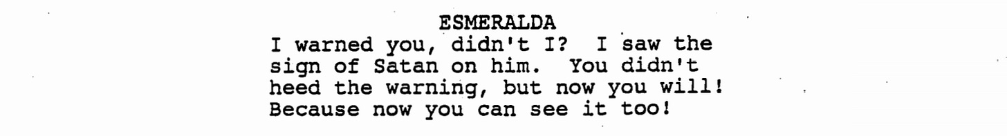Worth noting, Caroline Thompson’s screenplay refers to this mob as “vigilantes”. Vigilante justice is an American idea, predicated on Wild West tropes but really the idea of controlling the most violent, unwanted elements of society - in other words, Black people, Mexicans, Native Americans, etc. (I’ve written about this deeply, incredibly toxic American trope here, if you’re curious).