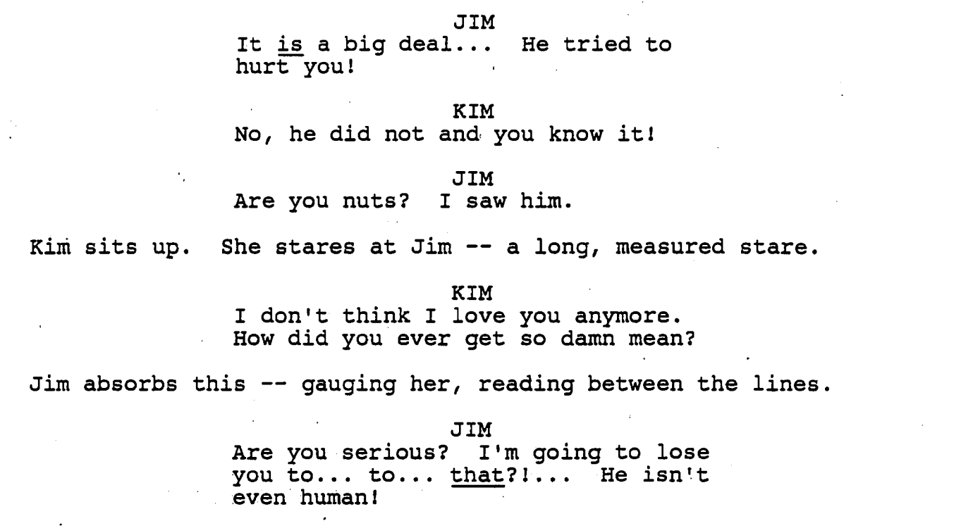 This accusation comes from Jim, the jock boyfriend of Kim who is bested by the sexy artist-outsider with scissor-hands. Kim has obviously chosen Edward over him. In the screenplay, the scene is more involved and intense, and Jim reveals that he doesn’t even see Edward as human. It’s typical othering, which can justify any level of violence — such as Jim trying to later murder Edward in his castle.