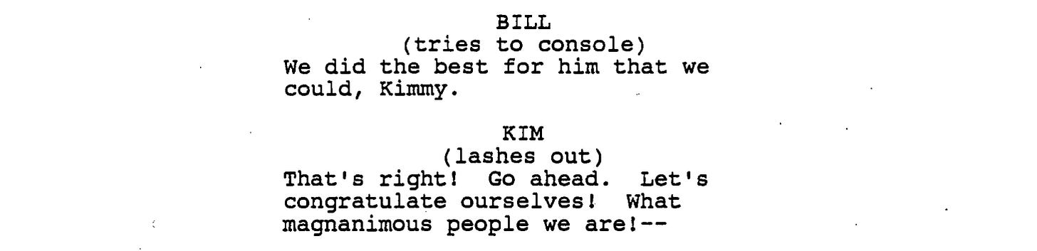 In the script, Kim reacts with disgust to their behavior, which is a damning indictment, I think, of superficial attempts by white America to address the consequences of slavery and the ensuing economic gap Black Americans have had to endure for generations. Here’s one for white saviors everywhere: