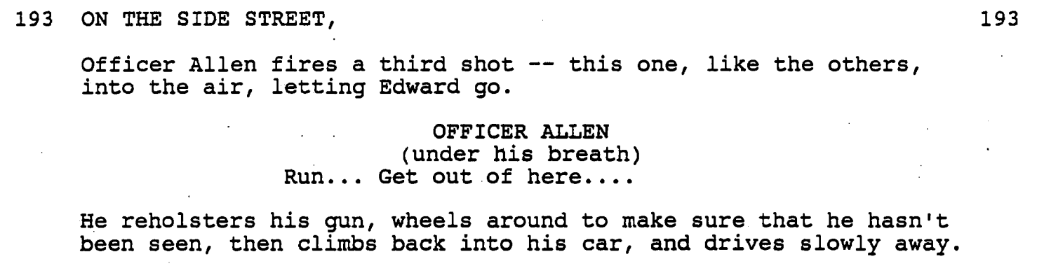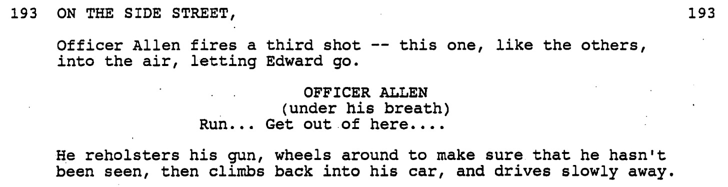 In the end, Edward only survives the film, to become a fairy tale monster living in a fairy tale castle, because Kim — not Officer Allen — tells the mob the lie that Edward was killed. It’s a fairy tale ending because, in real life, the cop would’ve killed Edward and, if not, the mob would’ve.