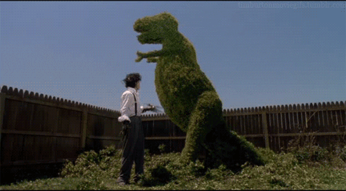 Alternative reading: it is an allegory of film-making, or maybe maleness. Tim Burton, the outsider, sees and observes things that have grown naturally such as hedges or hair, cuts them down (“the cutting room”) into a meta shape (a horse, a hair-do). This ability gives him acclaim and access, proximity to, maybe even intimacy with women, but he is not an ideal lover, with hands that can only cut, reduce. They can shape but cannot create live.