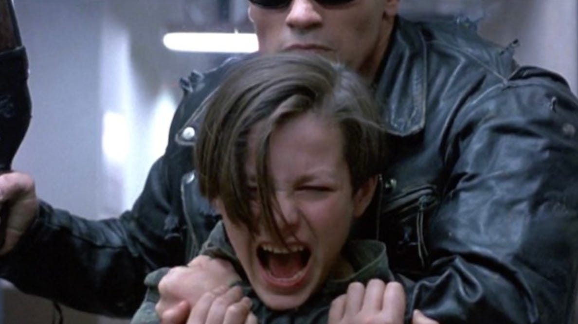 After a quick deviation from the original film’s structure to re-meet Sarah in an asylum where she’s being studied by the same psychiatrist who didn’t take her seriously in the first film, licked by lecherous men, and doing a lot of cardio that has her looking ripped. Personally, I think of this as the second half of the John intro beat, at least as it appears in the film’s structure. In other words, still more or less the same film as THE TERMINATOR.