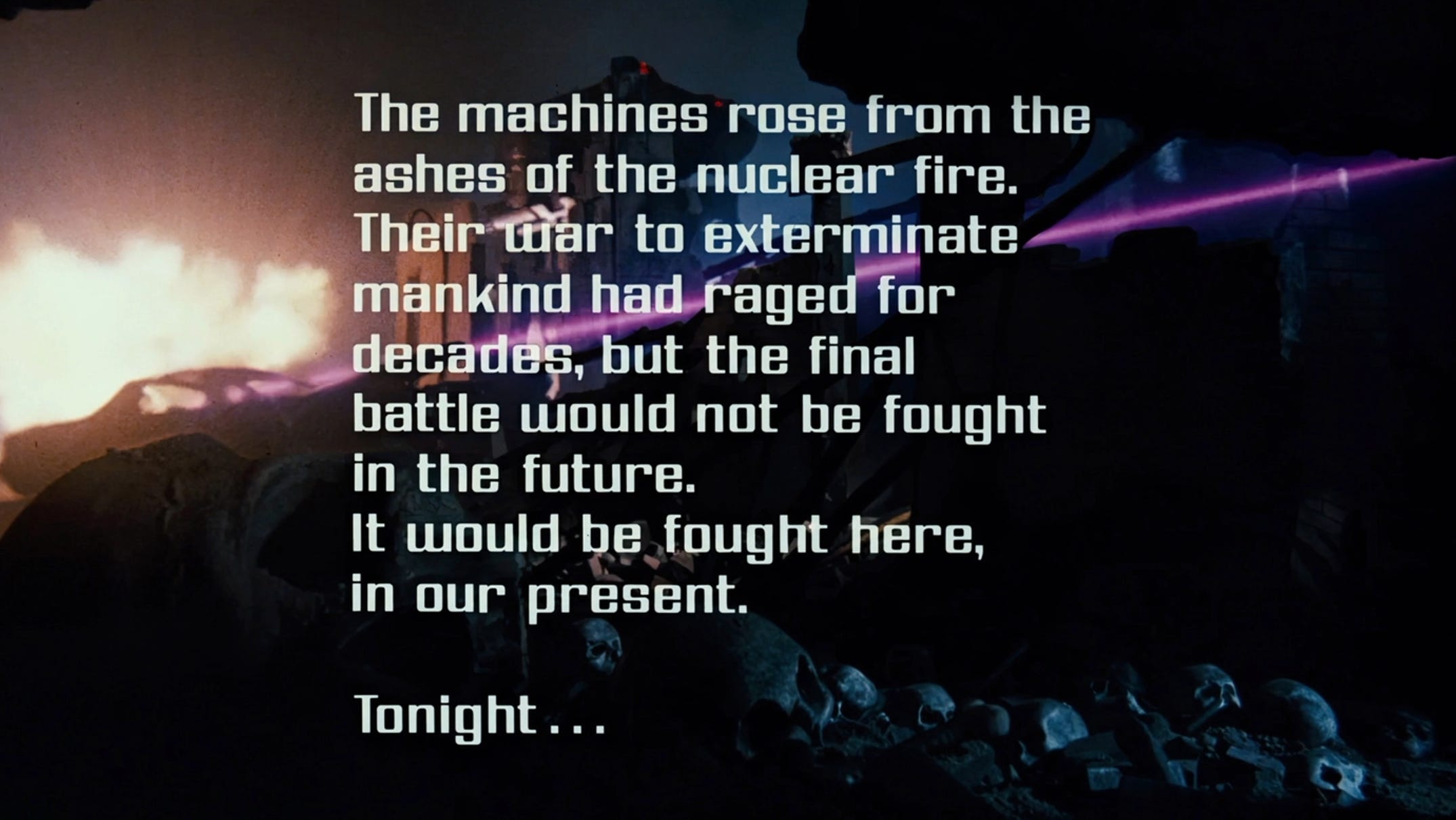 A title card and brief futuristic sequence introduce us to a post-apocalyptic world of machines where human beings appear to be fighting for their survival. The year is 2029.