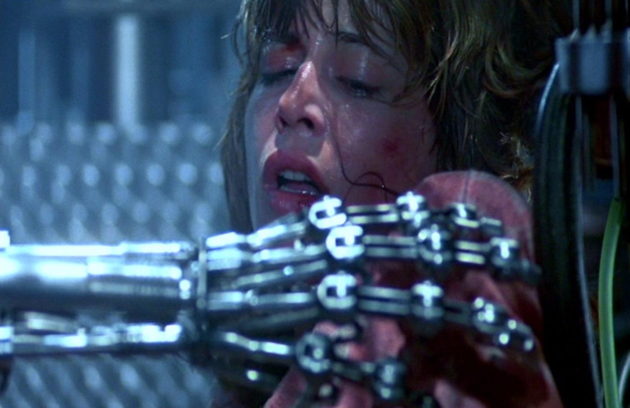 Sarah, injured, fights a maimed Terminator alone. But hey, good news, she’s triumphant. The Terminator crawls across a grated floor, after her, unwittingly into a metal press where she crushes him - leaving behind only a skeletal forearm and hand.