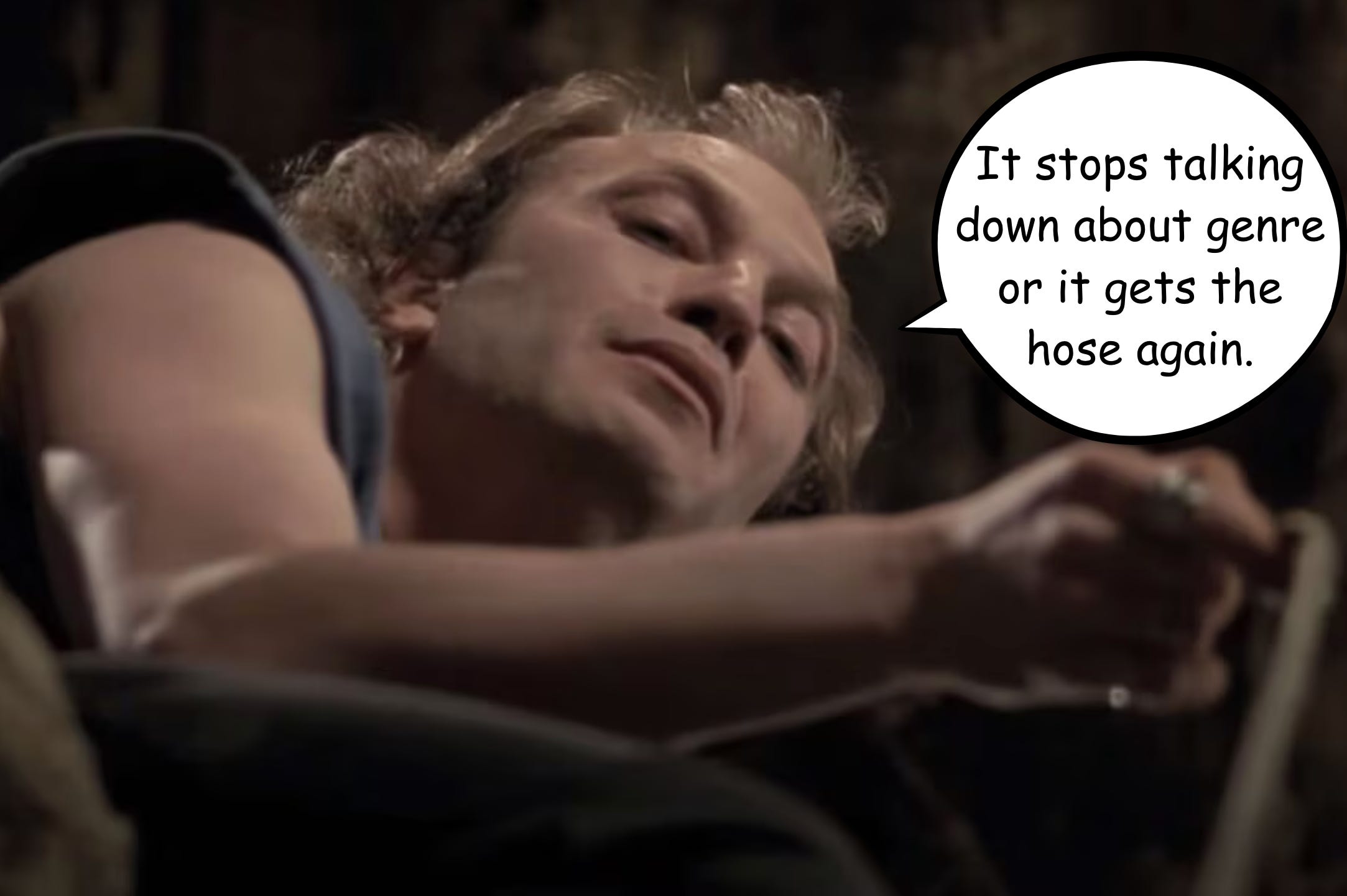 But therein, I think, is both the beauty and frustration of writing in a “genre”. It’s wonderful insofar as it can be a sugar-coating over highfalutin (okay, off-putting) ideas, as above, so people get to engage with my own existential twiddle-twaddle as much or little as they like, but when it’s tiring there’s “who wins the trophy” to fall back on…or “which kaiju’s gonna blast the nuclear lightning down which other’s throat?” That’s where genre is your savior, your best friend. Where its worst, for me, is when the writer lets it run the show - or sees it as enough. When the genre is the raison d’etre - the end-all, be-all of the movie: just hit the marks of what the genre asks for, limit your surprises to a rearrangement of the deck chairs, and go home. We have a word for product like that - and all it is is “product”. It’s called “generic”. As in, defined exclusively by and for the expectations of the genre.