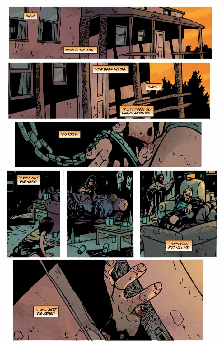 CH: Those longer scenes are certainly part of what I love so much about your graphic novels — and you’ve taken them to the next level in ALMIGHTY. Instead of cramming a scene into a page, you let it breathe and build like a film. One challenge I’ve sometimes found with illustrators is that, as brilliant as they are, I see story in terms of cinema. This means a kind of visual movement that is very different on screens than on the page, so I’m always pushing for a more “cinematic experience” — similar to what you were just describing. Unfortunately, I also write incredibly dense comic books, which really handicaps the ability to achieve that when you’re operating in, say, a four-issue series space and you’re telling a really big story. Your work, by contrast, puts a heavy emphasis on visual storytelling, sometimes more “silent film” than a traditionally scripted comic book story. Is that intentional on your part?