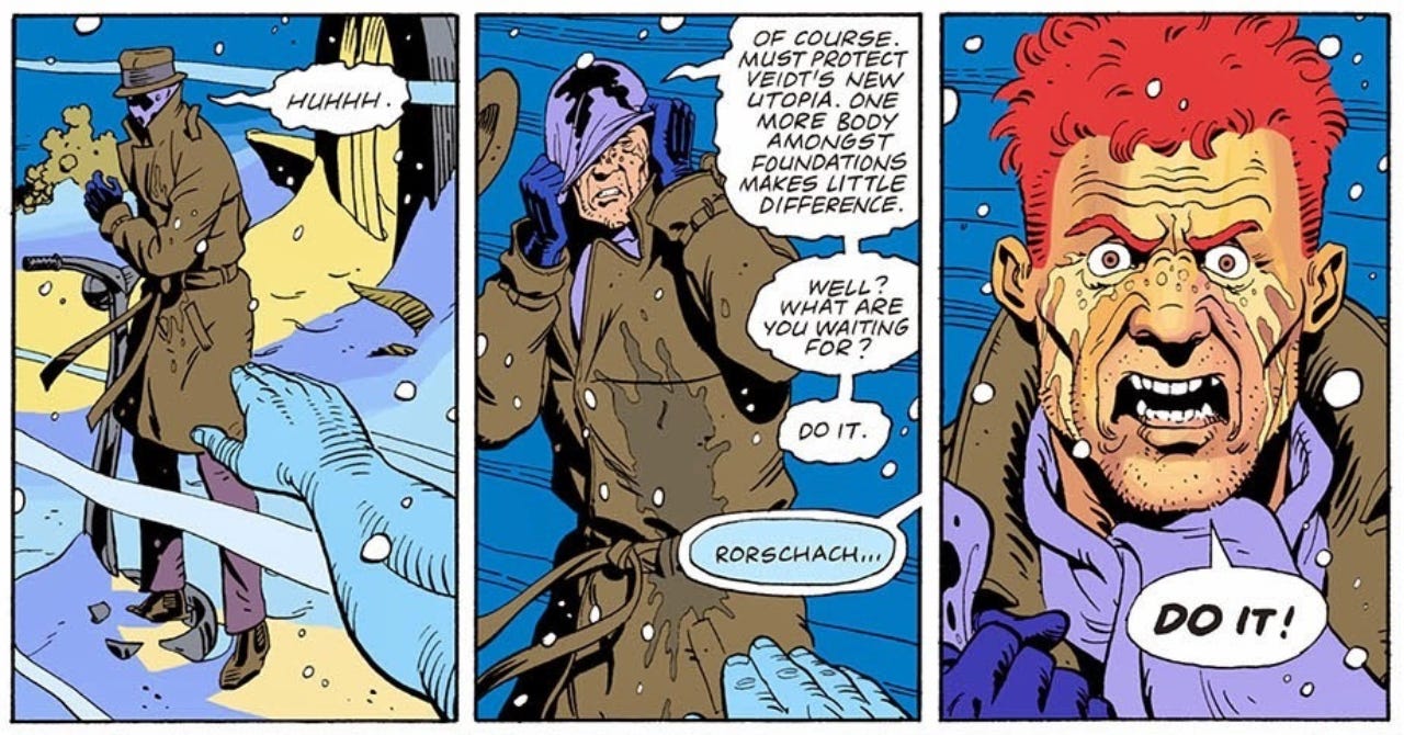 This is how Rorschach moves through his world, unbending in his convictions and absolute in his righteousness, the perfect mouthpiece for Thatcherism and Reaganism. He’s everything that’s wrong with Batman and similar characters in Moore’s estimation - that is, if one properly interrogates Watchmen.