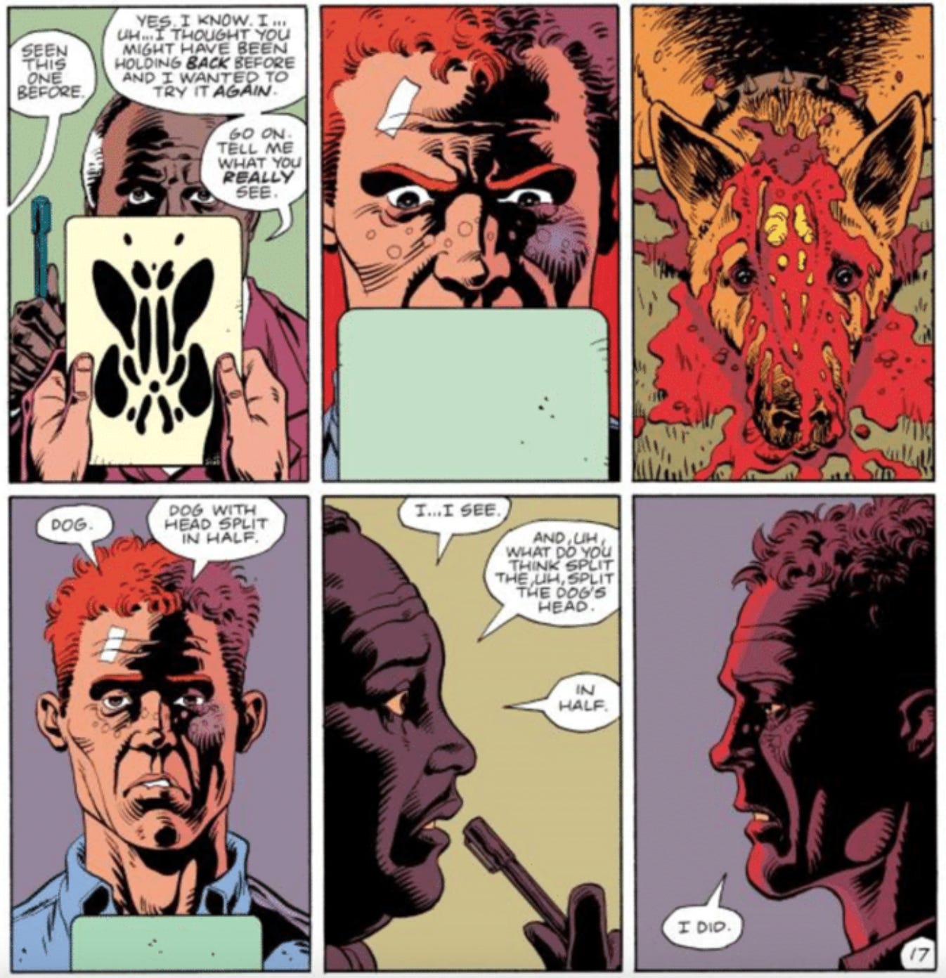 In the blink of an eye, Rorschach detonates into blood and gore. This image — this final literary Rorschach test — requires readers to tell the world what they make of the image.