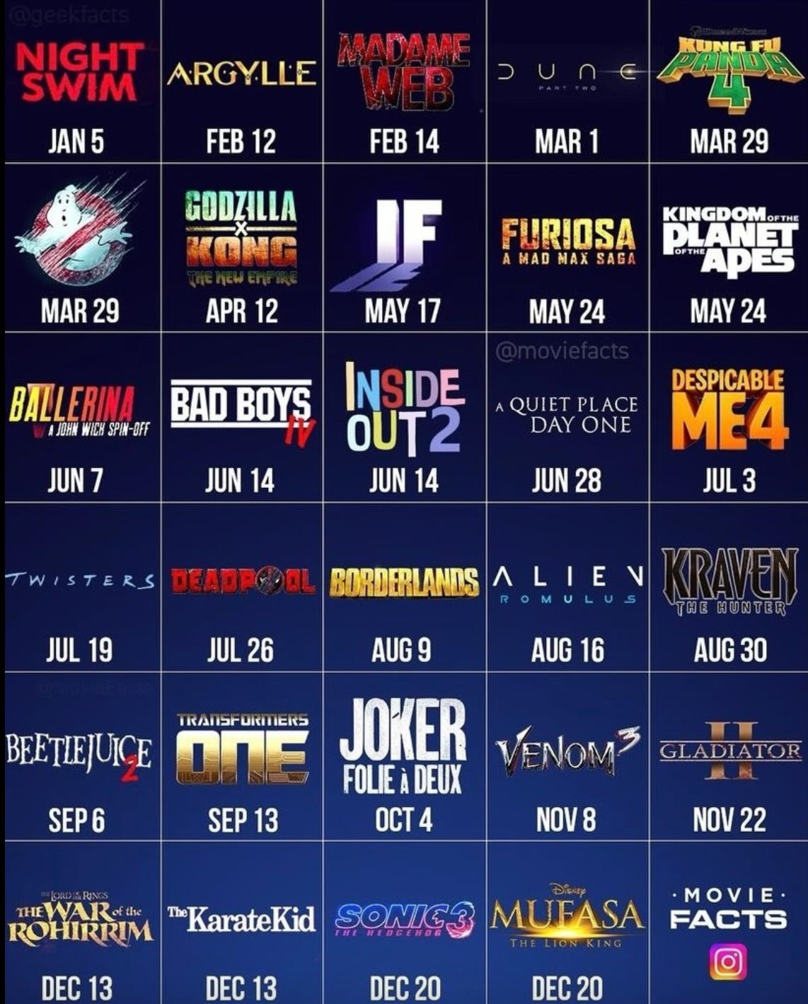 We don’t know how to escape what’s coming, and so the only reasonable options appear to be to retreat into older, more familiar forms of experiencing existence to help us bear the fact that we will all die in a world completely unlike the one we were born into and our children, in turn, will die in one completely alien to us. What I mean by this is endless reboots/sequels/requels. Consider U.S. studios’ 2024 theatrical release schedule. To look at this graphic is to feel ten again, at least for me.