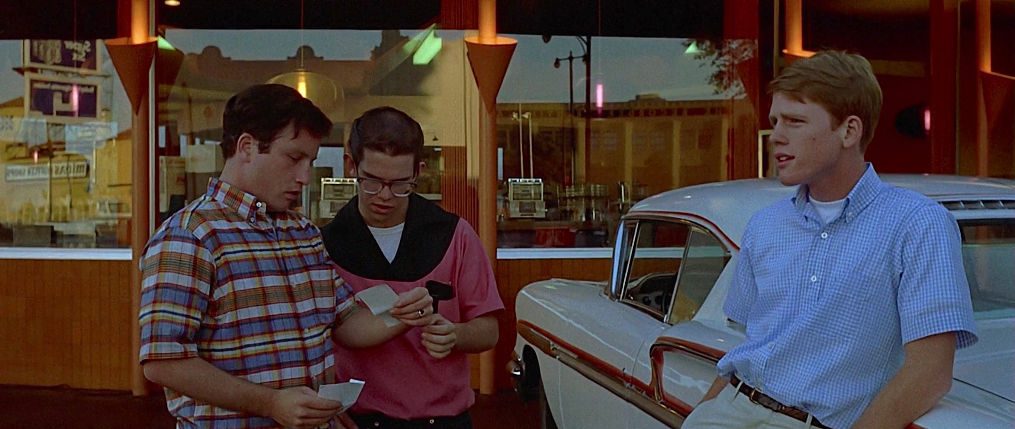 The fear I’m describing is especially dramatized in the character of Curt (Richard Dreyfuss) who, with his friend Steve (Ron Howard), is getting on a plane to college tomorrow morning. This is their last night of freedom, as they see it. Except Curt is having second thoughts. He sees what he’s saying goodbye to, what he’s trading for the unknown, and he convinces himself it’s a mistake to go. A fantastically beautiful blonde, an unattainable figure who keeps slipping away in her white cruiser, comes to represent his salvation from this mysterious future. If he catches her, it’ll all be okay. Except he doesn’t, and he decides to board the plane the next morning as planned. Ironically, it’s Steve, the one most vociferously committed to leaving, who abandons his out-of-state college plans; he’ll instead go to the local college so he can marry his high school sweetheart and become a boring replica of his parents.