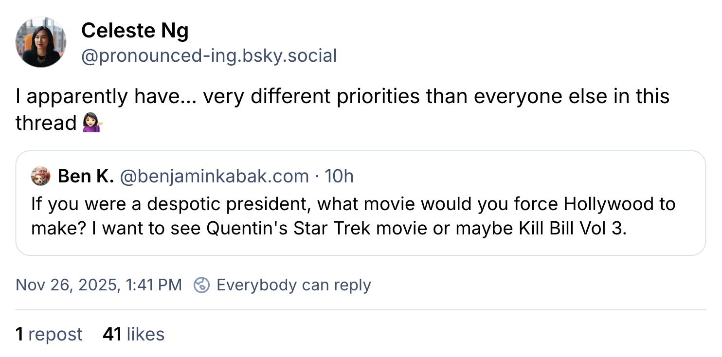 Back in November, a Bluesky account posed a question I’m going to steal and pose to you myself today. But with it, I’m going to include comments made by novelist Celeste Ng about it. I think her thoughts provide very necessary perspective, which I’ll be interested to see what you do with. Here’s the question in its entirety for you?